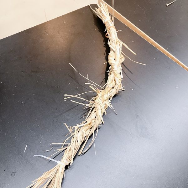 しめ縄をパッと見ると、2束のねじられたわらが撚り合っているように感じませんか?でも実は、3本の束で作られています。まずはきれいな縄に仕上げるために、3つの束ができるだけ同じ太さになるようにわらを集めました。だいたい20本ずつで、立派なしめ縄になるはずです。
