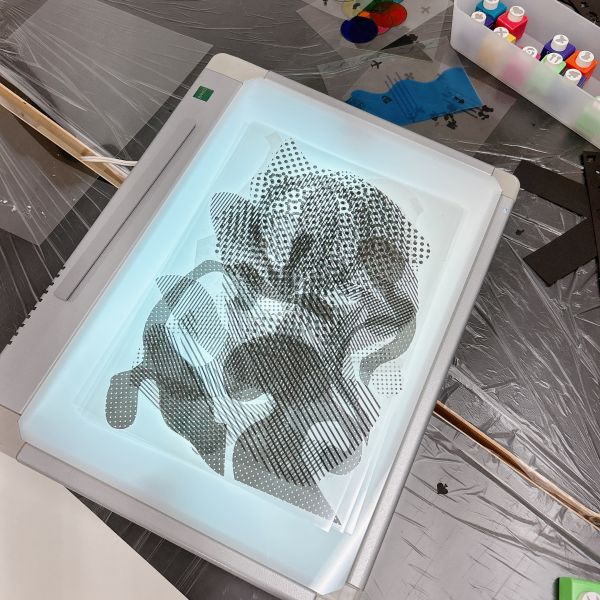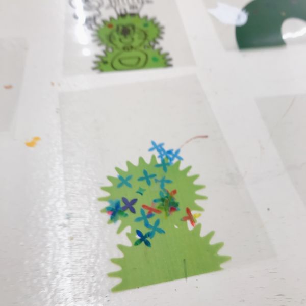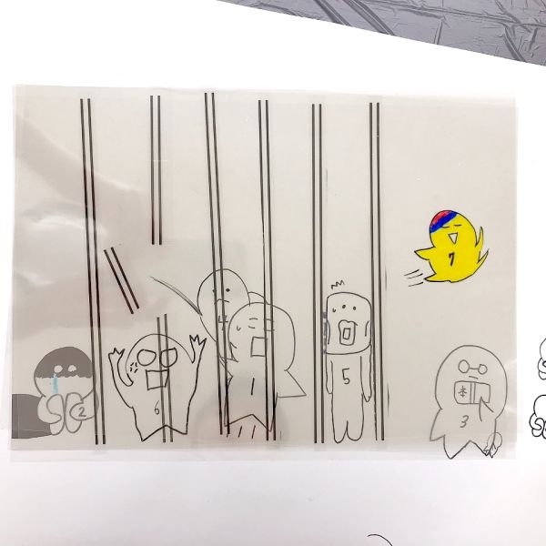 「ここ、おもしろいんですよ」と見せてくれたのは、各シートの全面にイラストがびっちりと描き込まれた作品。重ねてみると、絵と絵が偶然絡み合う様子がおもしろくて、描いた本人もいろんな発見がある様子で見飽きない。街のグラフティのよう!