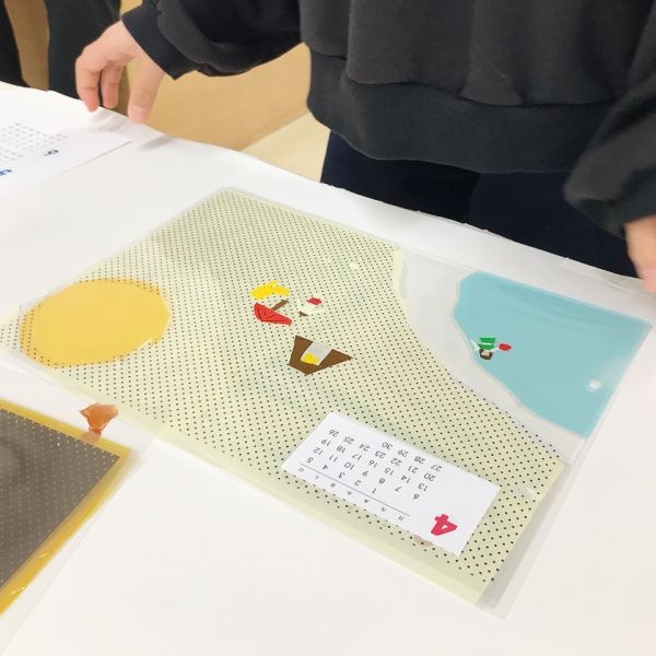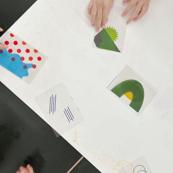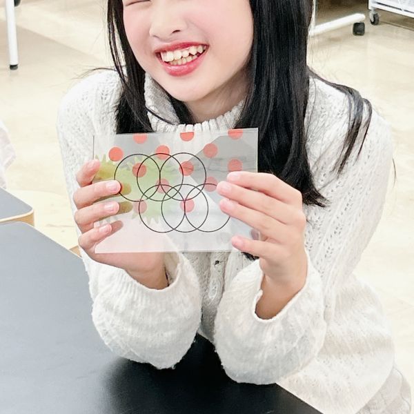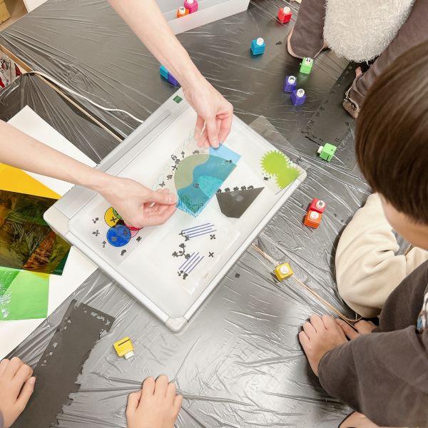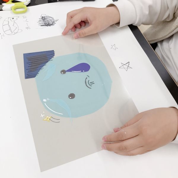 複数のシートをいくつか重ねるだけでも、思わず「おっ?!」と手が止まる絵がたびたび表れます。「こっちの組み合わせだと、全然ちがう絵になるよ」「何かタイトル付けられそう」「なるほど、いいじゃん」さっそく感覚がピンときた子も。