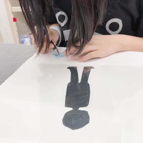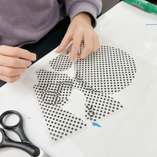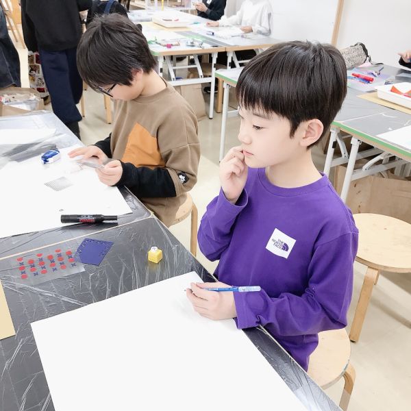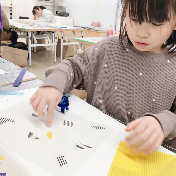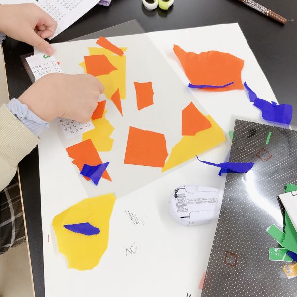 「いろんな表現ができそうだぞ」とアイデアが浮かんできたところで、それぞれの制作がはじまりました。ペンでどんどん描き始める子もいれば、トーン素材や色セロハン、半透明のトレーシングペーパーなどの効果的な使い方を試す子も。