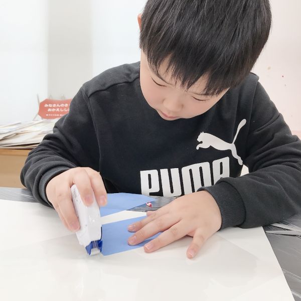 「長い持ち手をつけたらどうかな」と、木棒との組み合わせにチャレンジした子も!おおお、確かにこれは作ってみたくなる!柄を長くすると「床そうじもできる!」とにっこり。