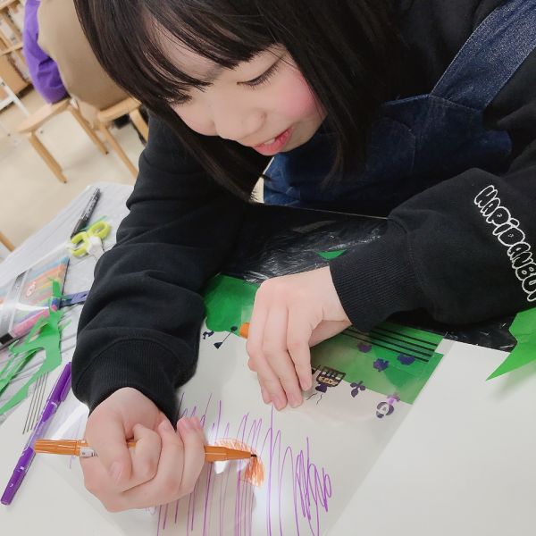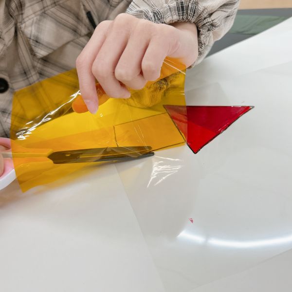 稲わら工作から一変して、年末はちょっと変わったプログラム!光を透かし、重なりによって表情を変える「透明」な絵に挑戦です。普段は紙に絵を描くことが多いこどもたち。いつもとちがう画面に描き、重ねた時にできるおもしろい効果や、新しい色や形を発見していこう!