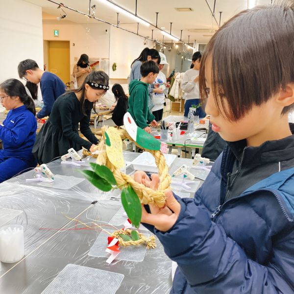 しめ縄を飾るためのパーツづくりも楽しい様子。紙で作る垂(しで)や、「淡路結び」とその応用でできる「梅結び」などの水引も、こどもたちに人気でした。ひとつひとつが手作りです。ひもをリースのリボンのようにアレンジしてオシャレに使いこなす子も。