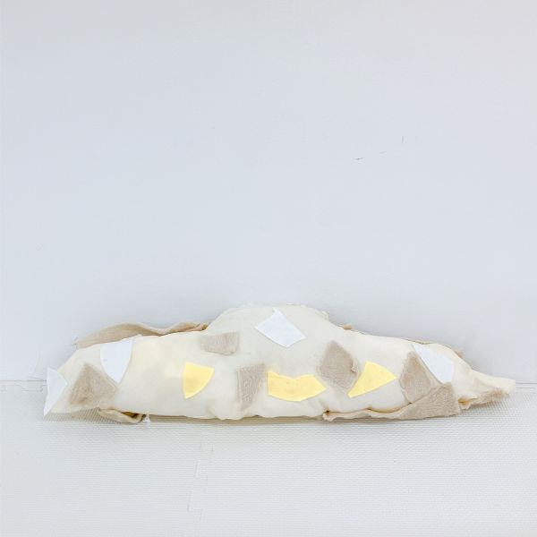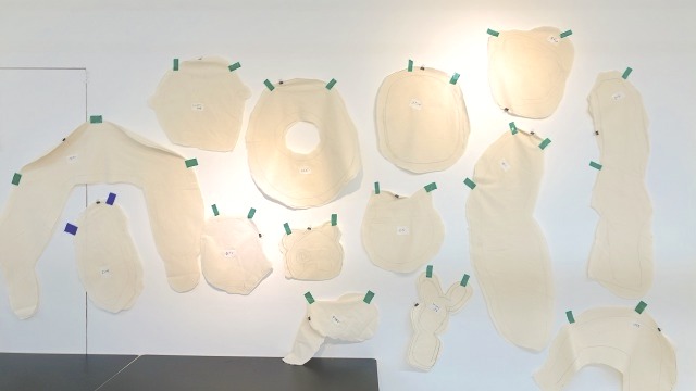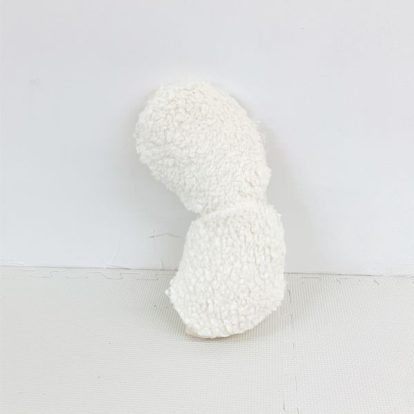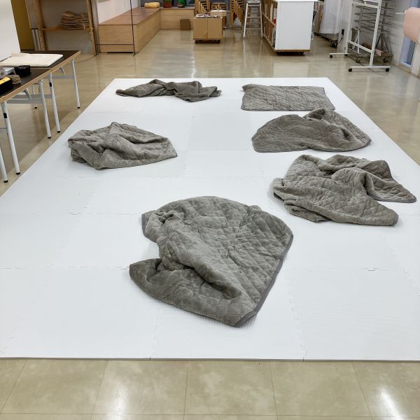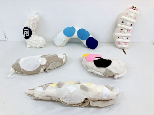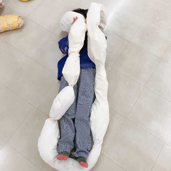 こちらは、太い・細いが何度も繰り返された、ながーい形を制作中。体に巻きつけて使いたいそうです。細いところは自在に曲げられ、太いところは抱いたり頭を乗せたりできますね。すごい発想だ!