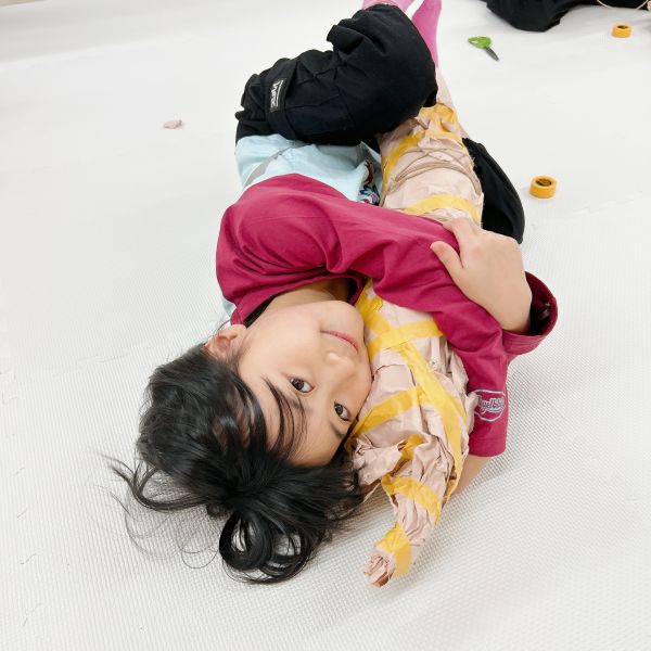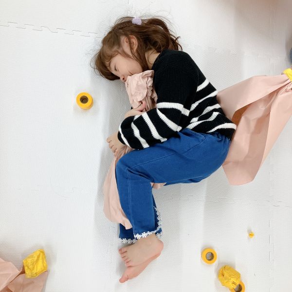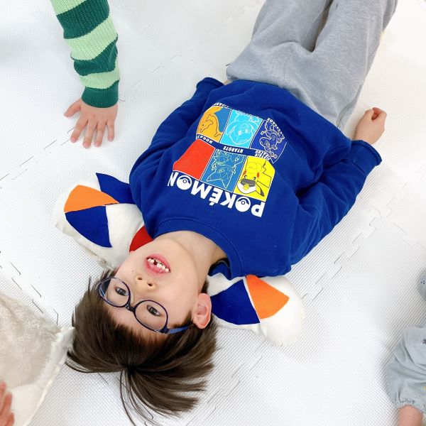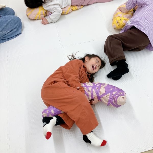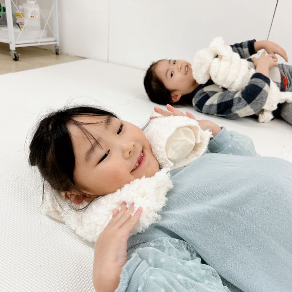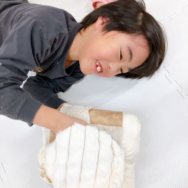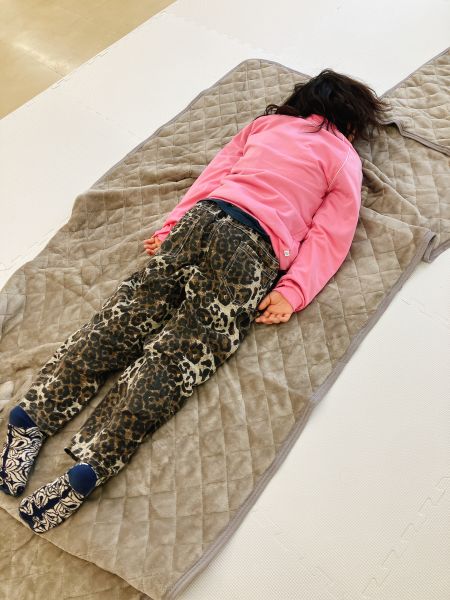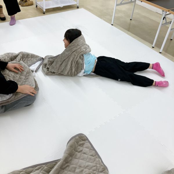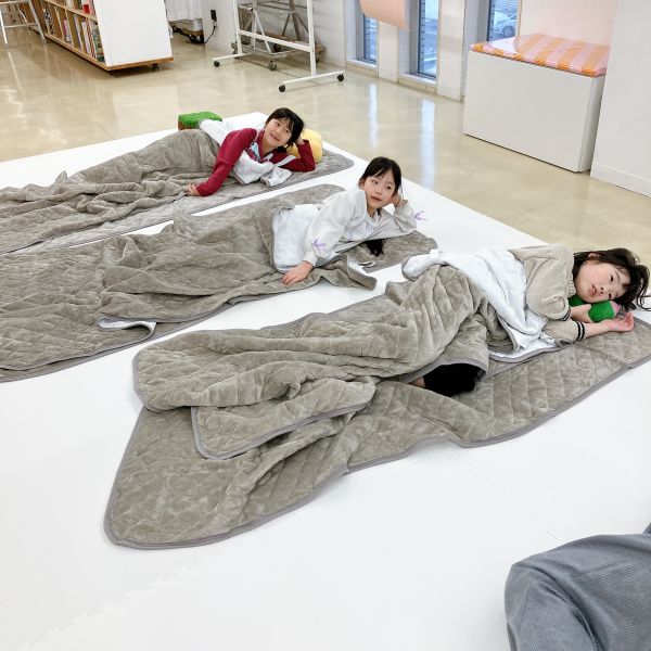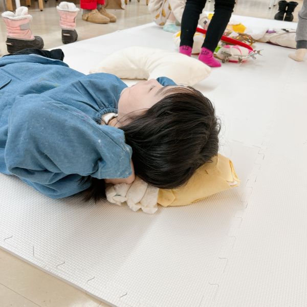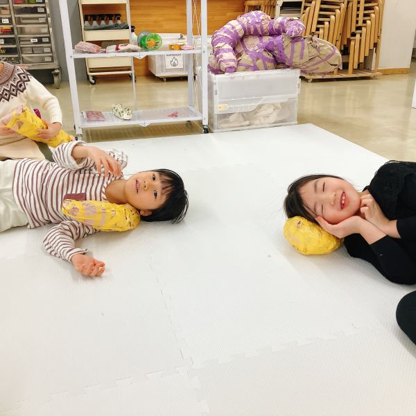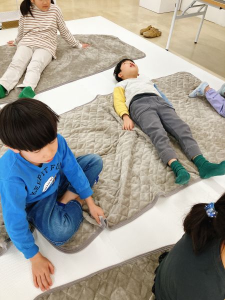 新年のはじまりのトルネードの教室には、お昼寝したくなるようなカーペットと毛布が登場。こどもたちは「わーい!ちょうど眠たかったんだ」「いやだ!寝ないよ!元気だもん」それぞれの反応を見せながらも、みんな思わずごろんごろん。