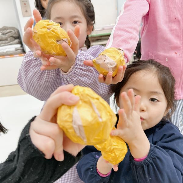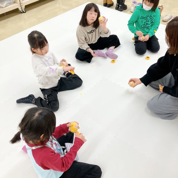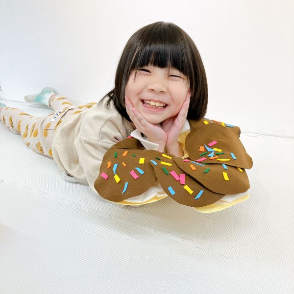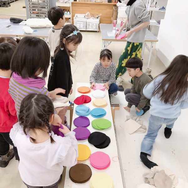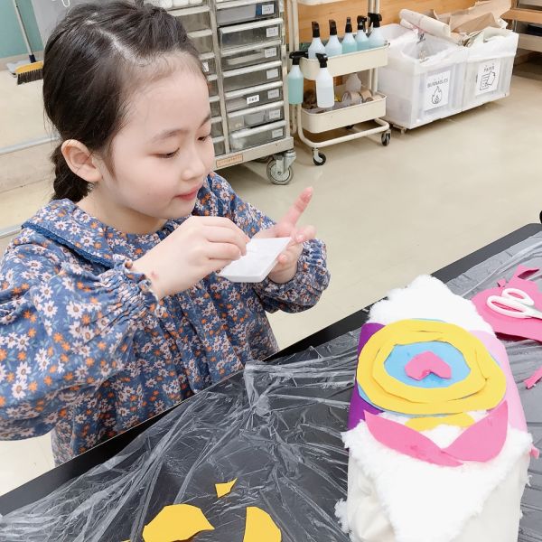 リング状の形を作っていた子は、その形を生かしてドーナッツ風の柄に。さらに目をつけてみると「真ん中の穴が、口になったよ」表情も生まれて、すごく楽しい!