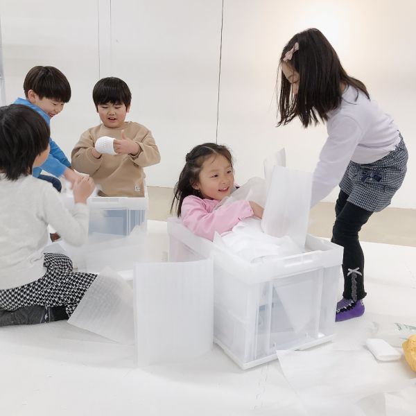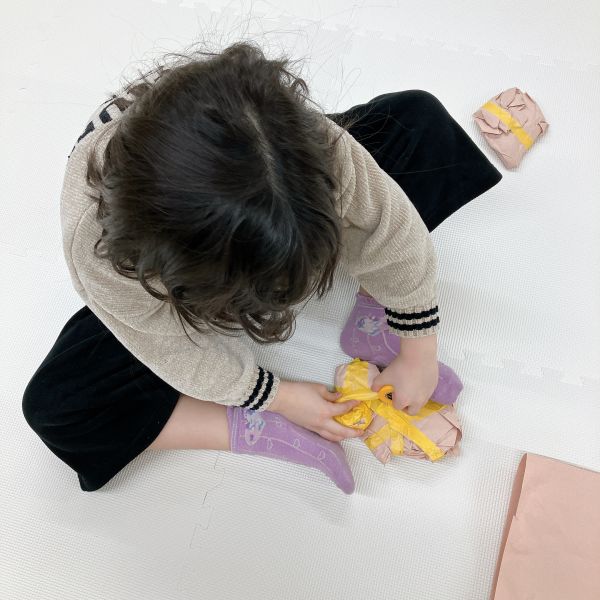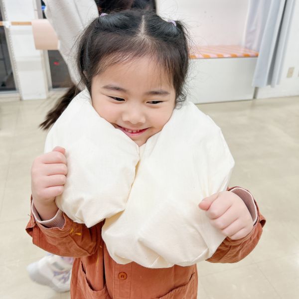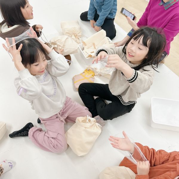 「さらさら!」「ツルツル」 「もじゃもじゃしてた」「うぶうぶ」「もこもこだった」こどもたちが、中の感触を教えてくれました。中身を出してみると、いろんな質感の布。同じ白でも、いろんな触り心地。