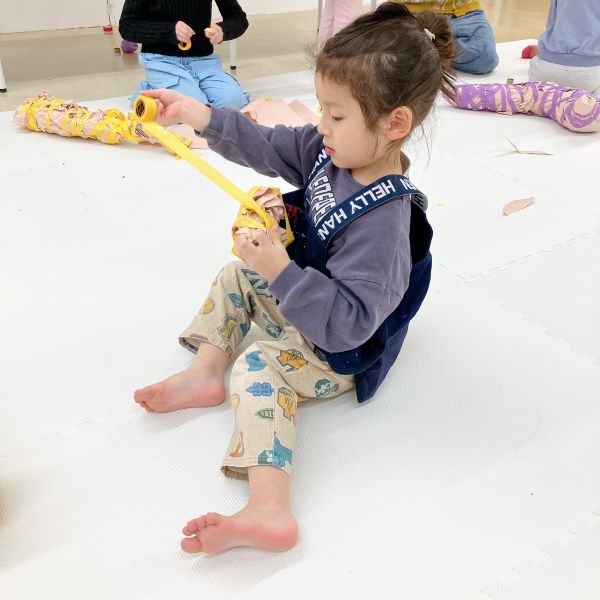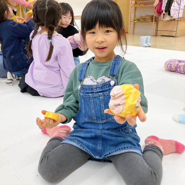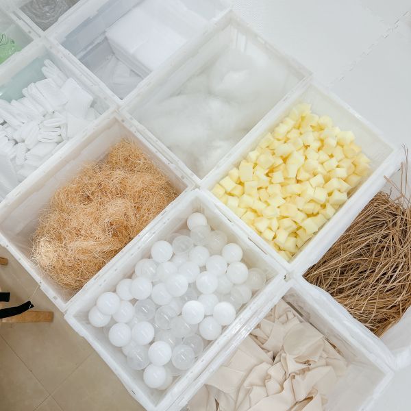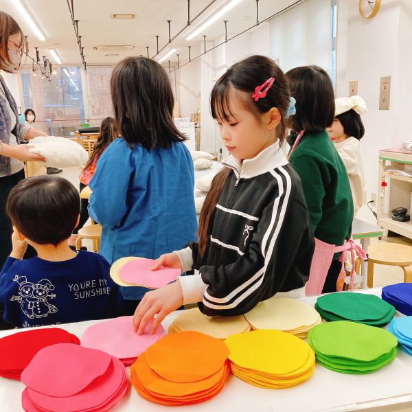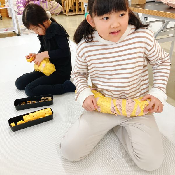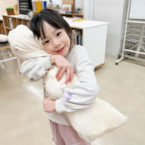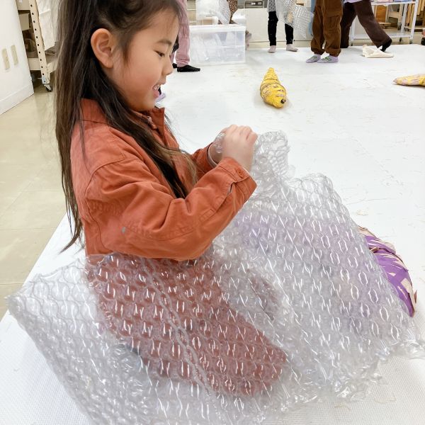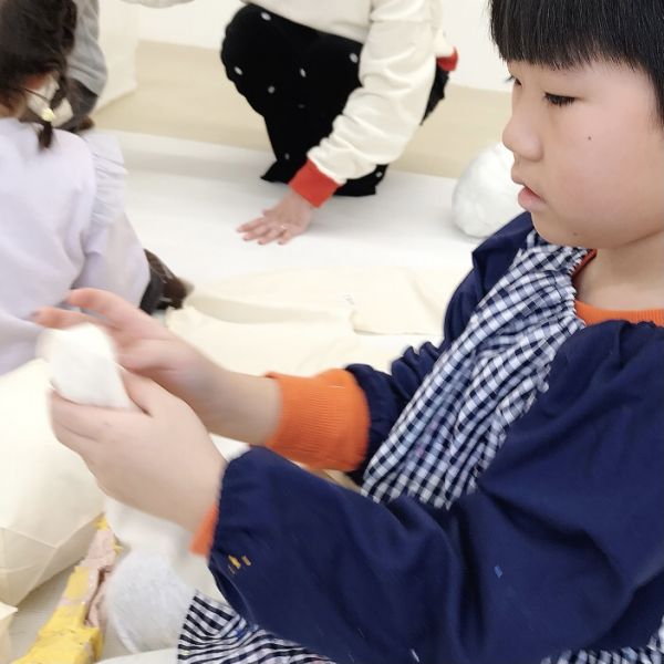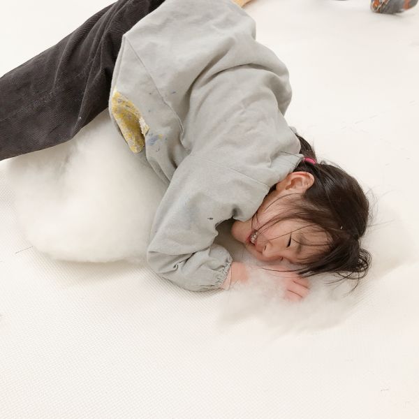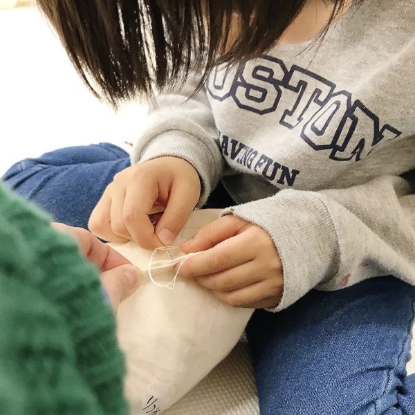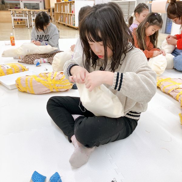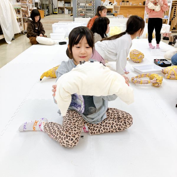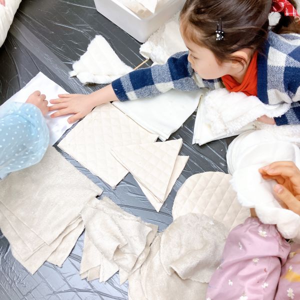 何度も感触を確かめながら、入れたり出したりを繰り返し試し、まるでオリジナルの枕づくりみたいに本格的!自分の「気持ちいい」「うれしい」「落ち着く」などの感触が見つかった子から、自分の作品の中身を詰めていきました。