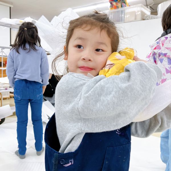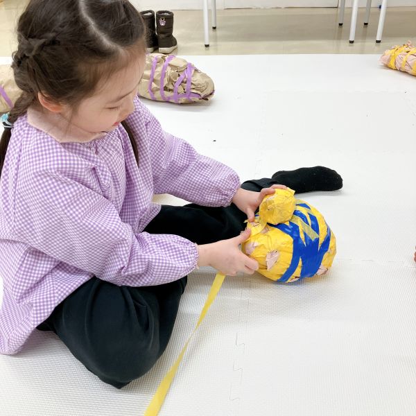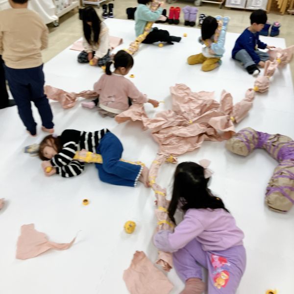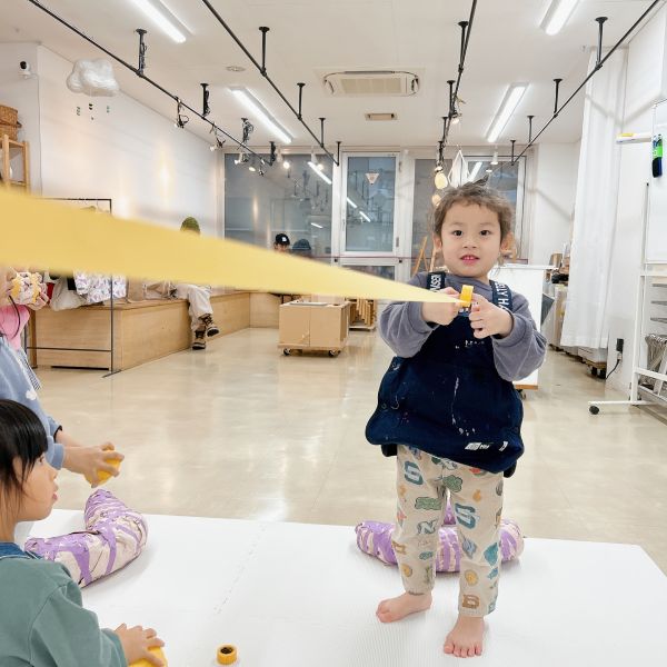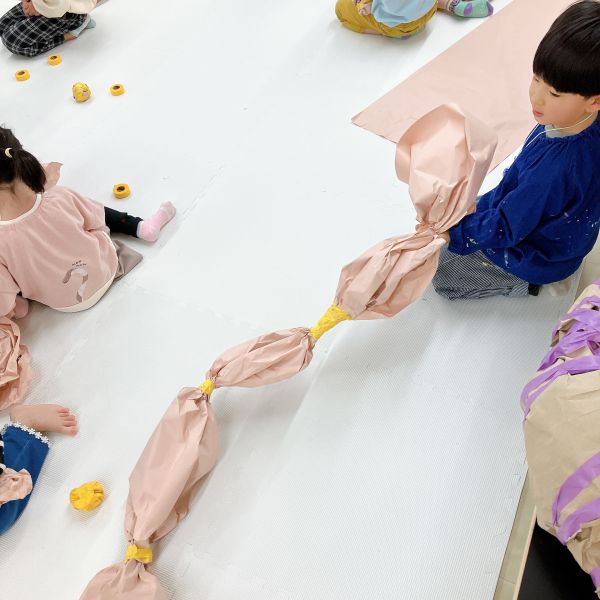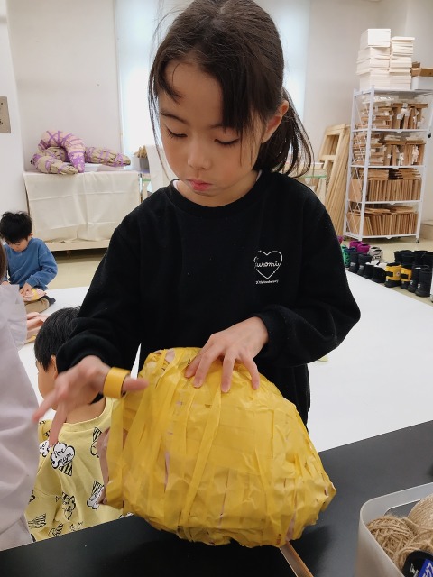 小さな子たちもまわりの子たちの様子を参考にしつつ、工夫しながら徐々にコツを掴んできた様子。両手だけではたりなくて、足も使って作ってる!小さい子ならではの体の使い方です。次はさらに大きめの紙を重ねて、ボールをどんどん大きくしていこう。紙とテープはどんどん使っていいですよ!