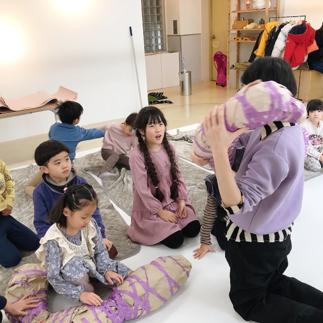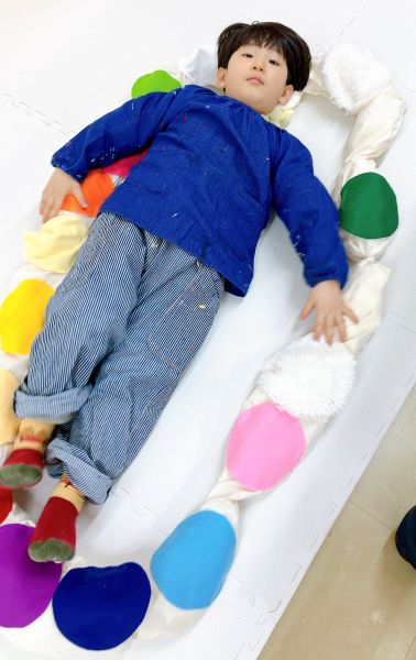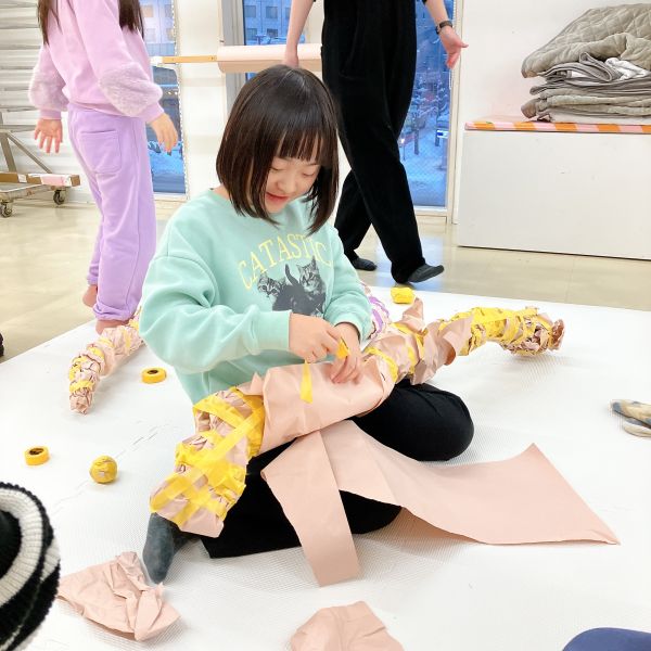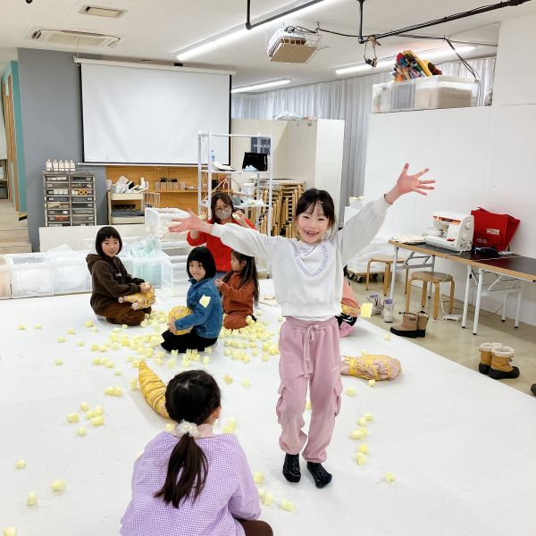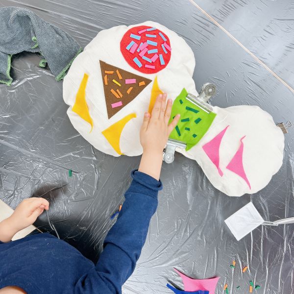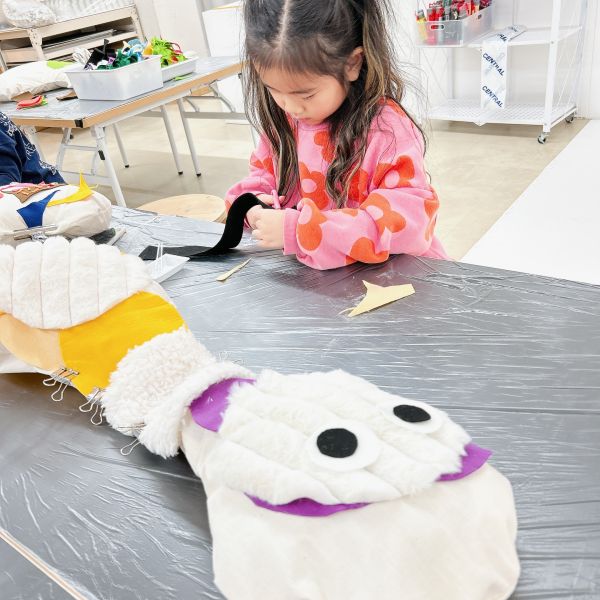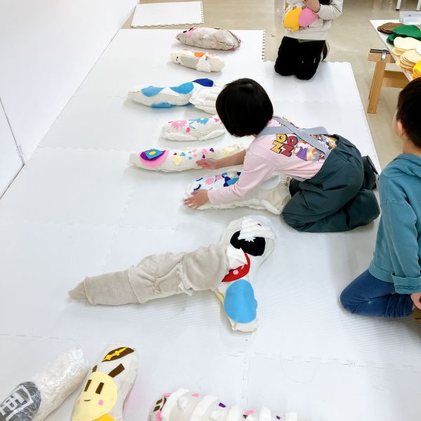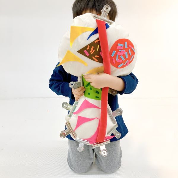 さらにカラフルなフェルトや、いろんな柄の布も登場。見てるだけでこどもたちの想像力がむくむくと...形や弾力が、自分の体にぴったりのソフトスカルプチャー。ここからは作品の「見た目」も、とっておきのお気に入りに仕上げていこう。
