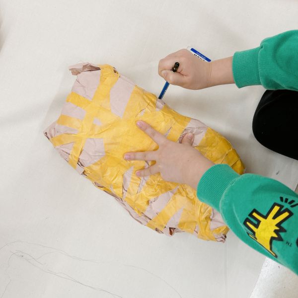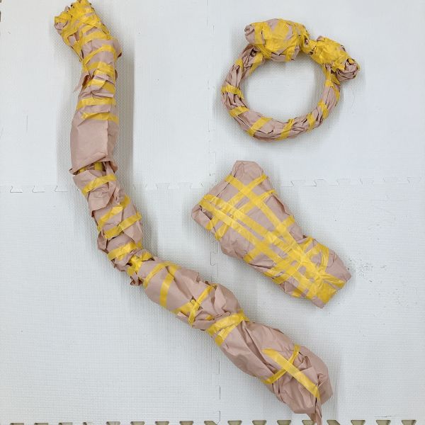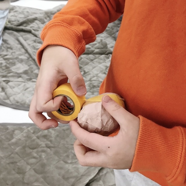原型づくりをする紙のかたまりは、体をのせたり抱いたりしてもつぶれないくらい、しっかりした密度が欲しいところ。そこで、紙をぎゅっと丸めたあと、さらにテープをぐるぐる巻きながらさらに固く締めていきます。片手で丸い形を押さえながら、もう片方の手でテープをひっぱってみる。「うーん、むずかしい」「ふにゃふにゃだ」
