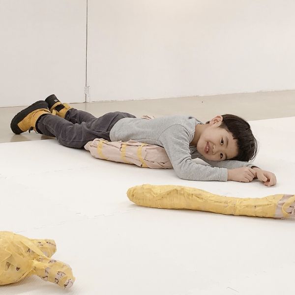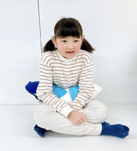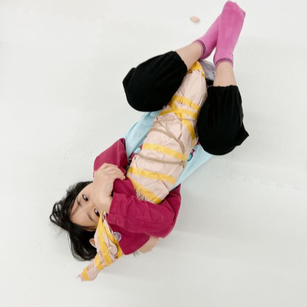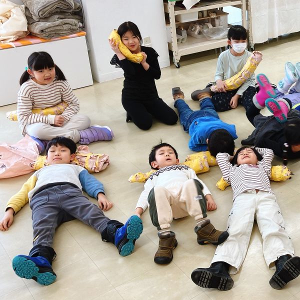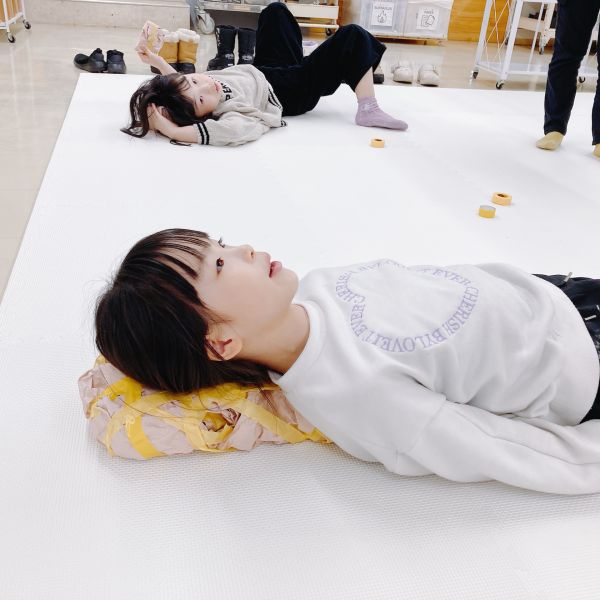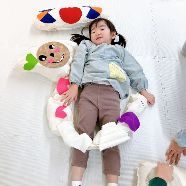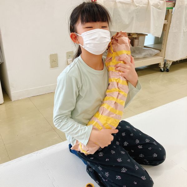 「あ〜きもちいい」「ここもぴったり!」自分の身体と作品が一体になって「寝ちゃうよ〜。いいの?」ほんのり夢心地の子も。さらにフィット感を研究する子もいたりして、みんな自分の「相棒」から離れません。