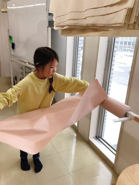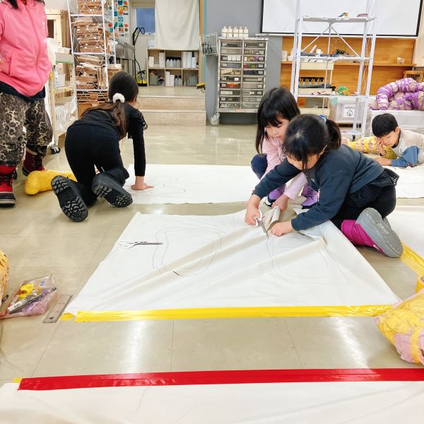自分の「相棒」の形が決まったら、布で制作するための準備をしていきました。紙とちがって、布はキッズにとって扱いにくく、ここがひとつの難関になりそう。まずは何人かで協力しながら、それぞれの半分に折りたたんだ布を床にしっかりと固定。
