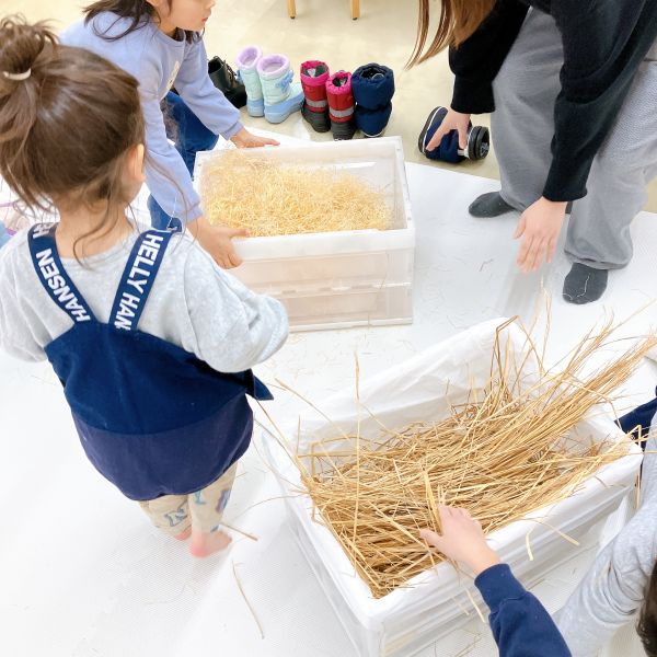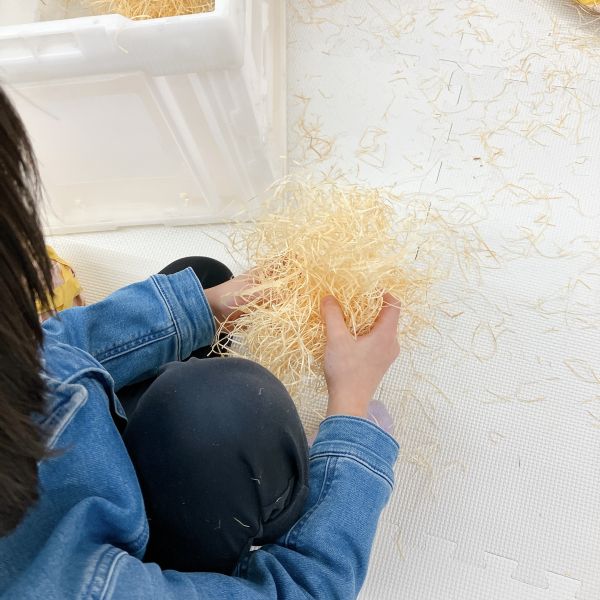 こちらは細かく裁断された木の緩衝材。触るとカサカサと乾いた音がします。もうひとつのカサカサ素材は…”稲わら”。お米を収穫した後の穂を乾燥させたものです。この感触は…「牧場みたい!」