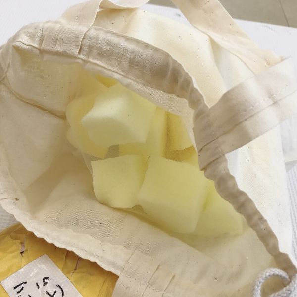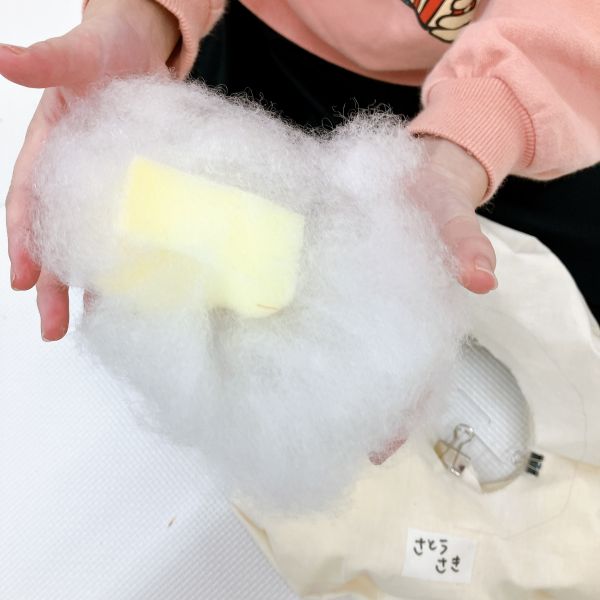 実際に作品に使う時は、素材そのままではなく、布の中に入れて使いますね。そこで、作品に似た布袋の中にそれぞれの素材を入れて、感触を確かめてみることに。ふんわりな素材も、たくさん詰めると弾力が増していきます。