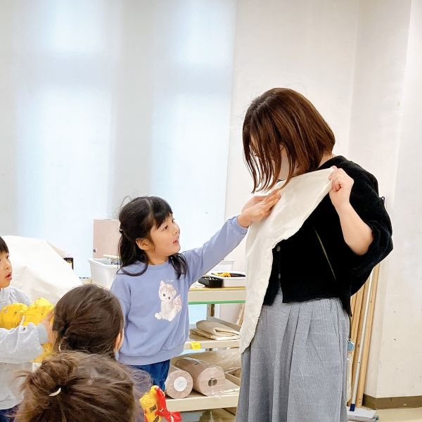「できた!」と、あっという間に縫い上げた子は「もう縫うものないの?」ともっと続きをしたい様子。ていねいな作業で縫い目をきれいに仕上げる子は「すごい!」とみんなの尊敬の的。お迎えにきたお母さんたちも「わあ、縫ってるの!?」と、こどもたちの様子を間近で見守ってくれました。