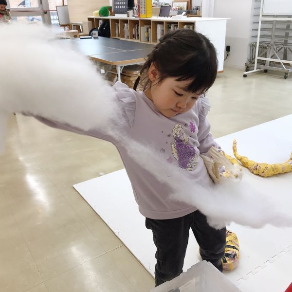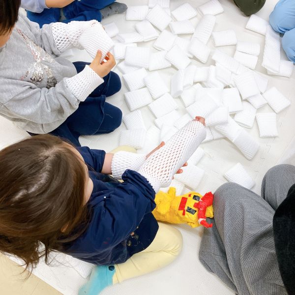 絵の具制作などでもたびたび登場する、柔らかいスポンジやポリエステルの綿は「あったか〜い」「ふわふわだあ」「やわらかい!」と気持ちよさそう。こどもたちに大人気。いろいろ触れて、感触を確かめました。