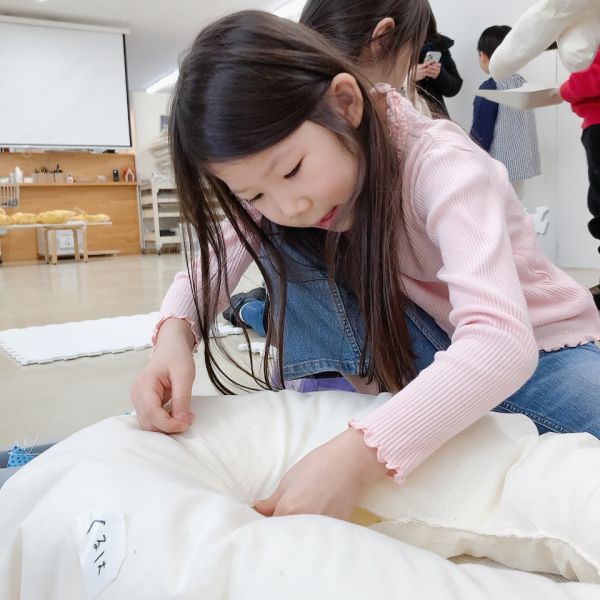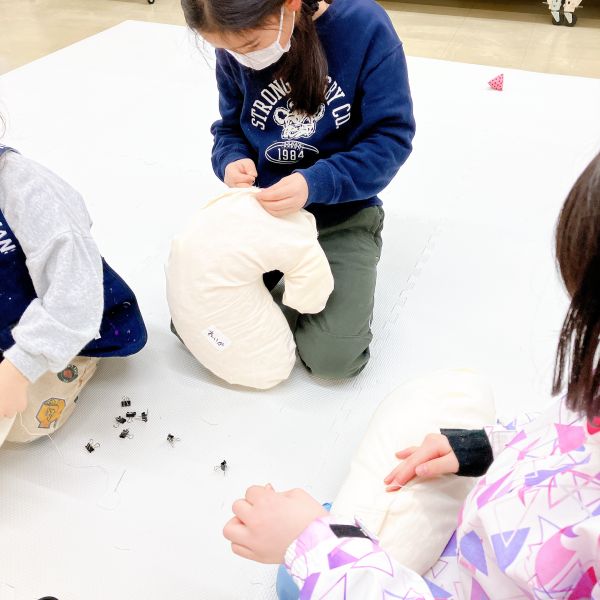中身をしっかり詰め込んだら、針と糸で口を縫って綴じてみよう。「ええ?!」」縫うのはじめてだよ!?」「無理無理!」小さい子は特にびっくりしていましたが、せっかくの機会なので作品の一部分だけでも体験してみることに。