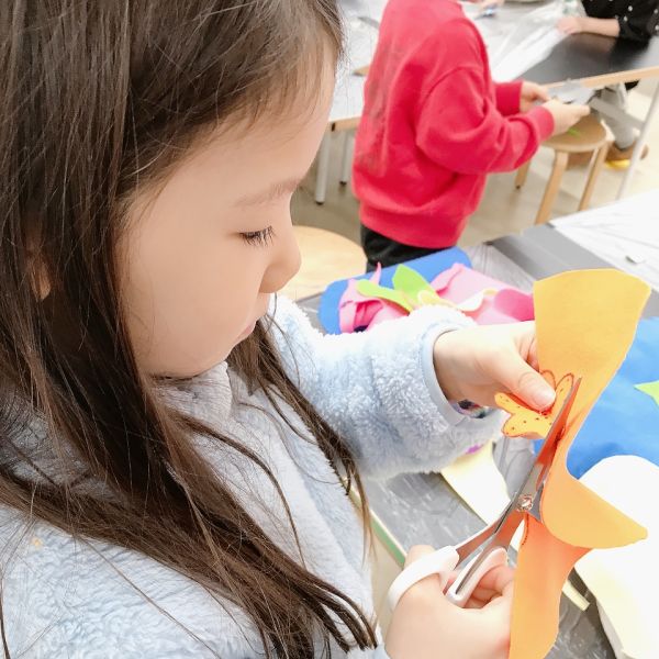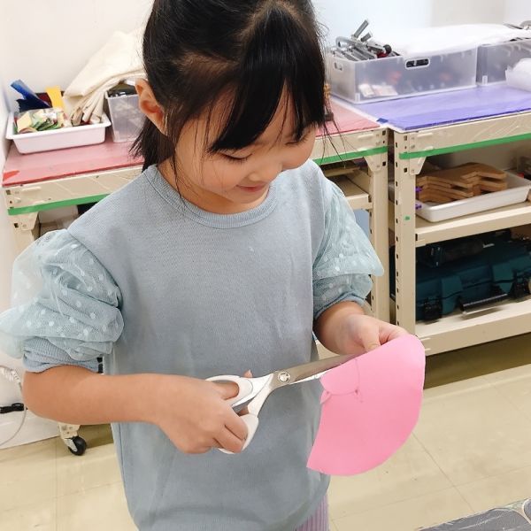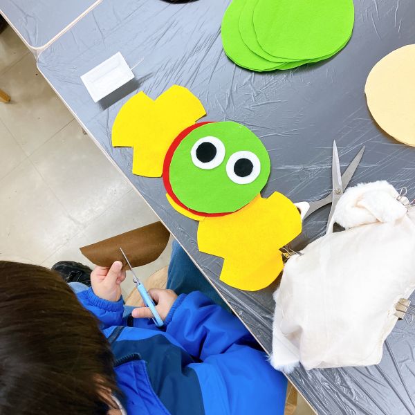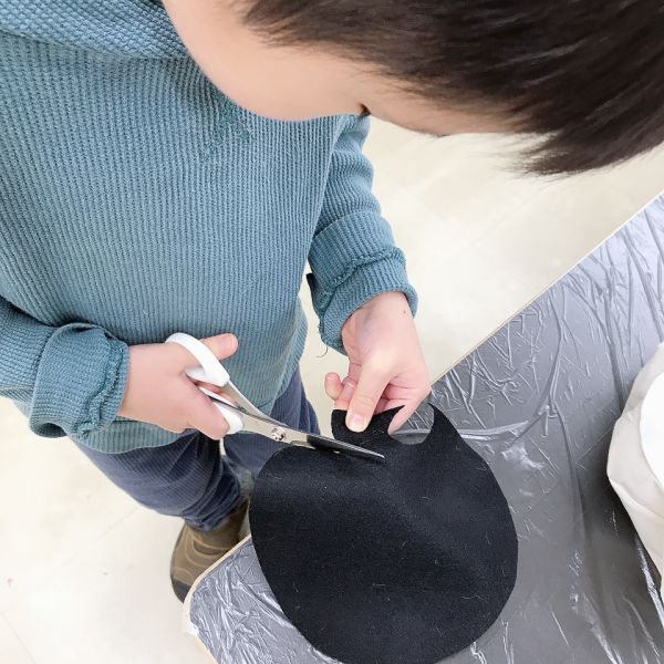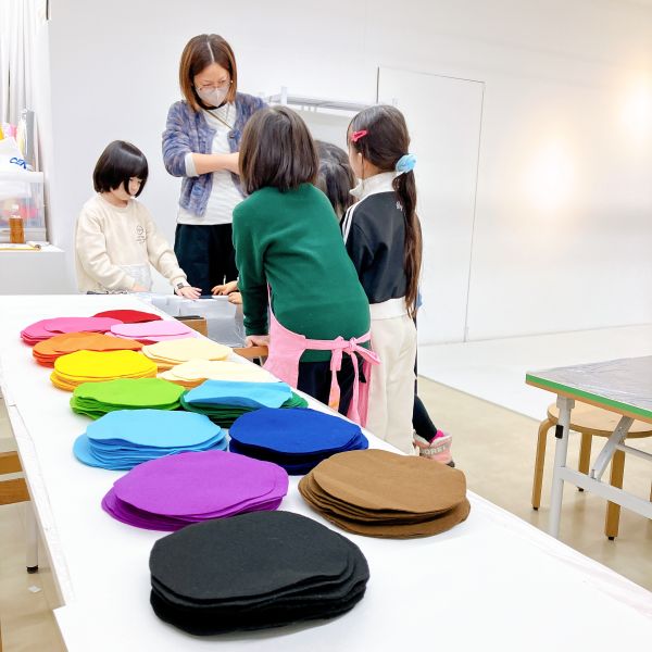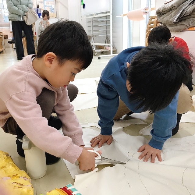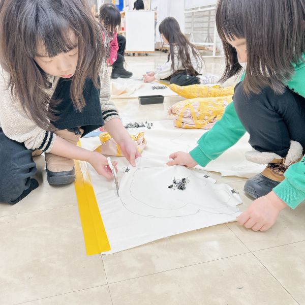 今月初めて使った、布を切るための裁ちばさみ。大きな刃物ですが、小学生はもちろん、小さな子たちも使い慣れてきた様子で、じょうずに布を切れるようになりました。それぞれが作りたい、形や細かな模様のパーツをどんどん作って、いろんなアイデアが登場しました。
