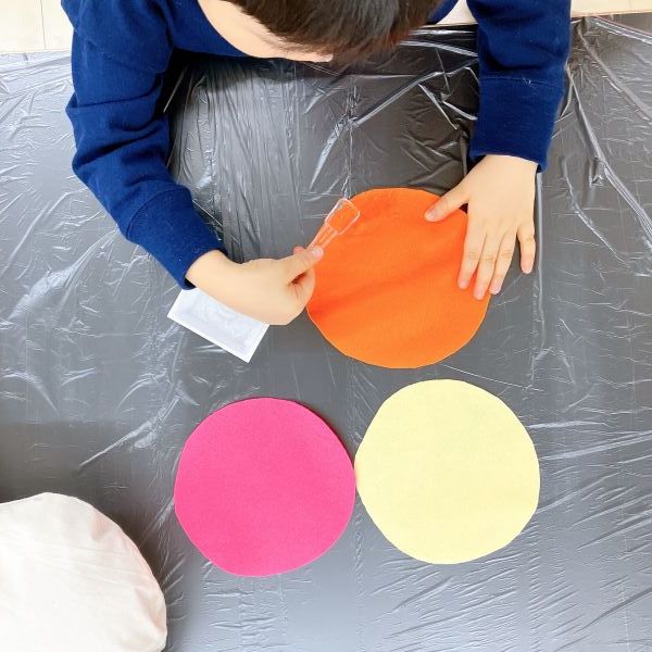 縫う制作が好きな子は、チクチク針と糸で縫い付ける様子も。よりたくさんの布を手軽につけたい場合は「布用ボンド」もおすすめです。乾いても固くならないので、作品の感触も損ないません。「これなら細かい形もいっぱい貼れる!」