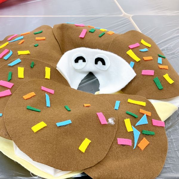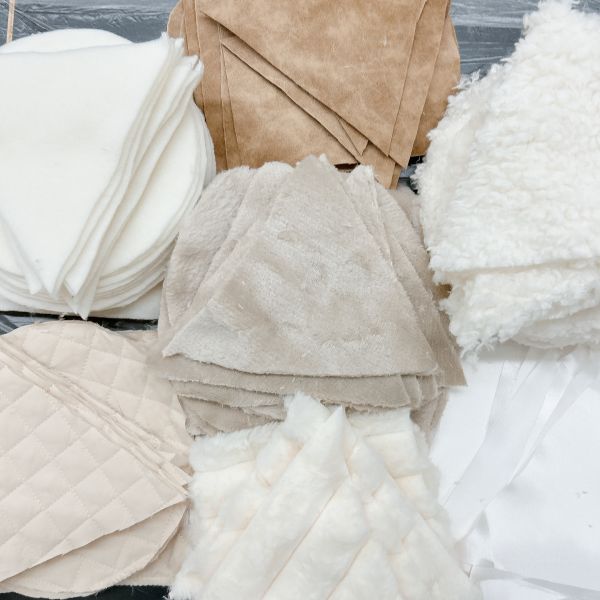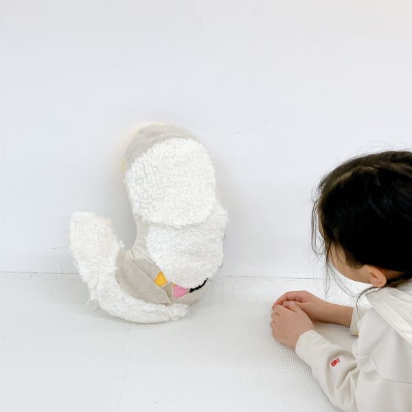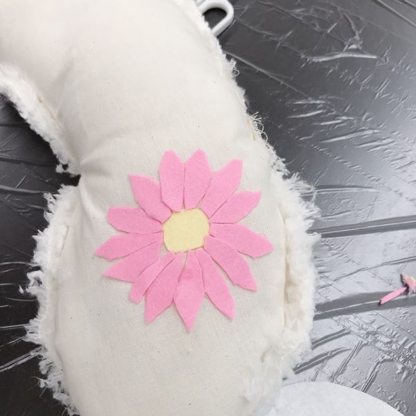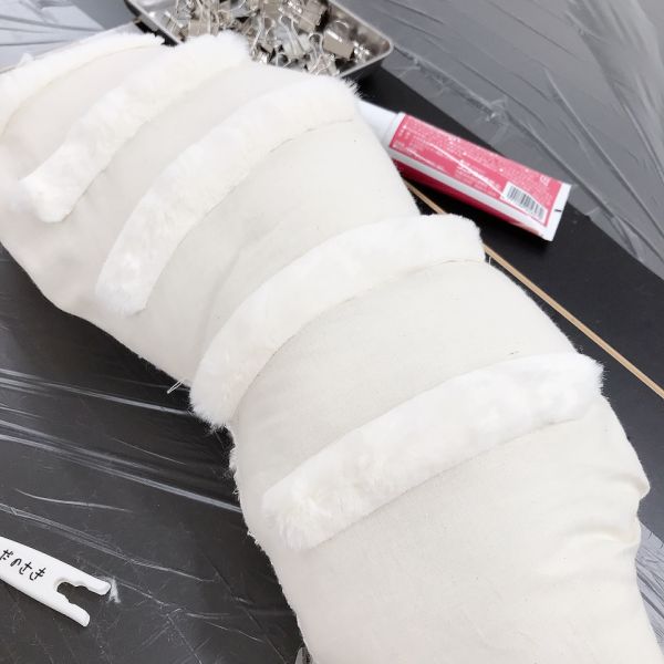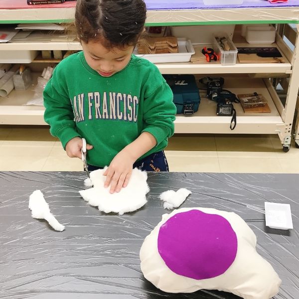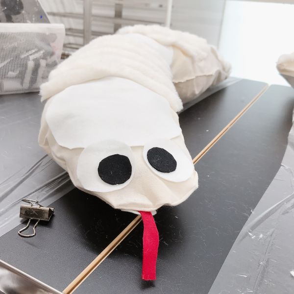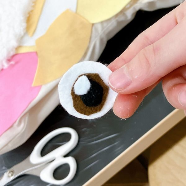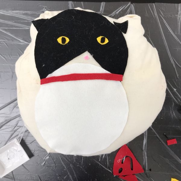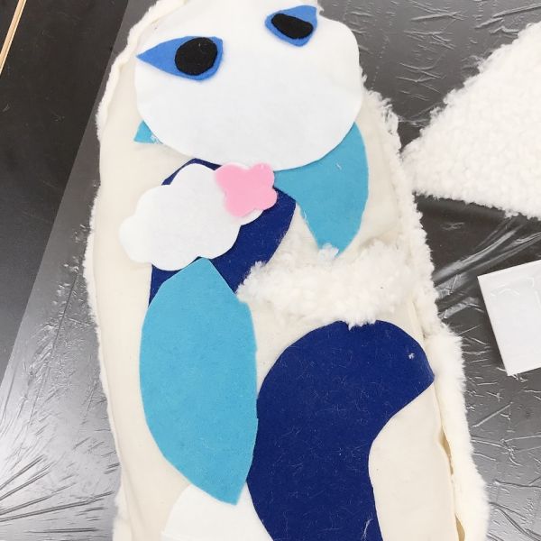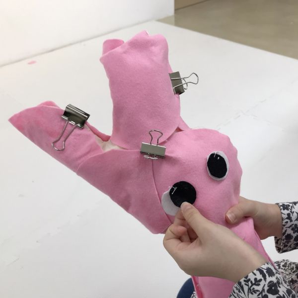 見た目も大事ですが、この作品は触り心地もとても大事なポイントです。「ここは顔がくるところだよ」「ここは首にあたるところ」それぞれにぴったりな質感の布を選んで貼っていました。