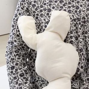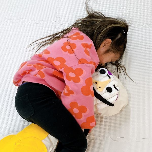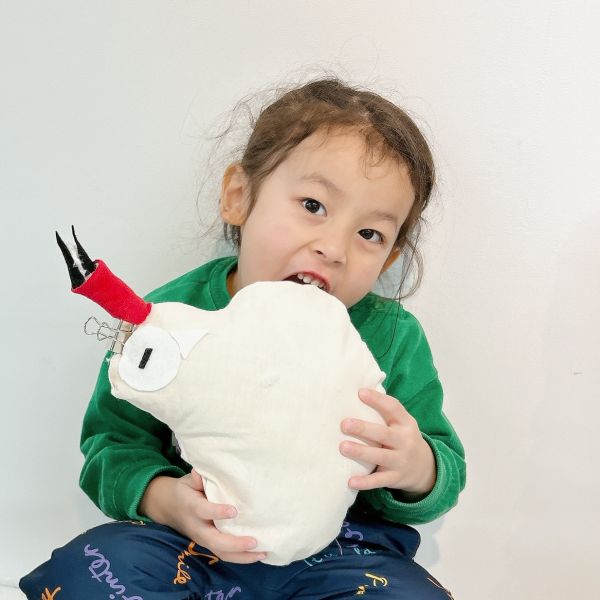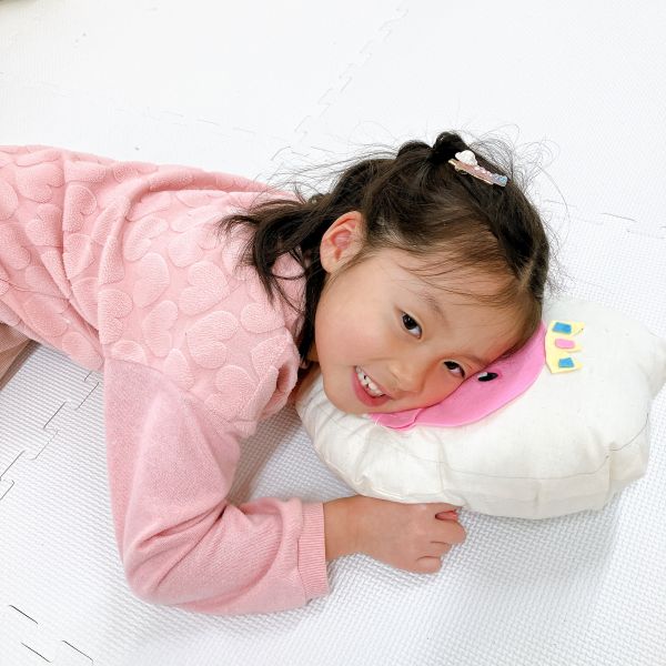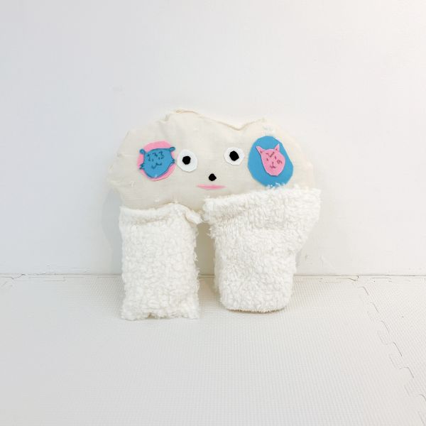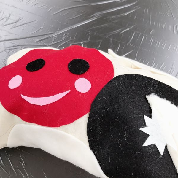 こちらの子は丸い布を切って左右対称の模様をつくり、大胆に配置!この色と形の組み合わせだと、つい赤い部分に頭や顔を乗せたくなるかも...