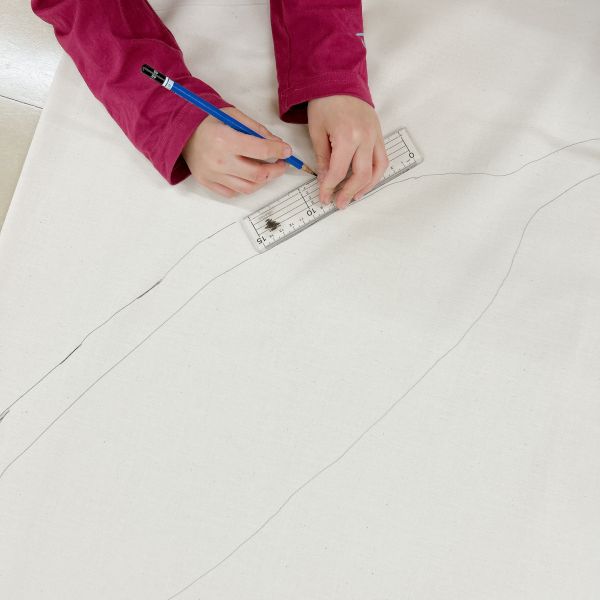 さらに、形のまわりにぬいしろを付け足して描きます。できるだけ等間隔でまわりに線を引くため、目安になる物差しを配布。曲線は少しずつカーブに沿って動かしながら、形を拾っていきました。