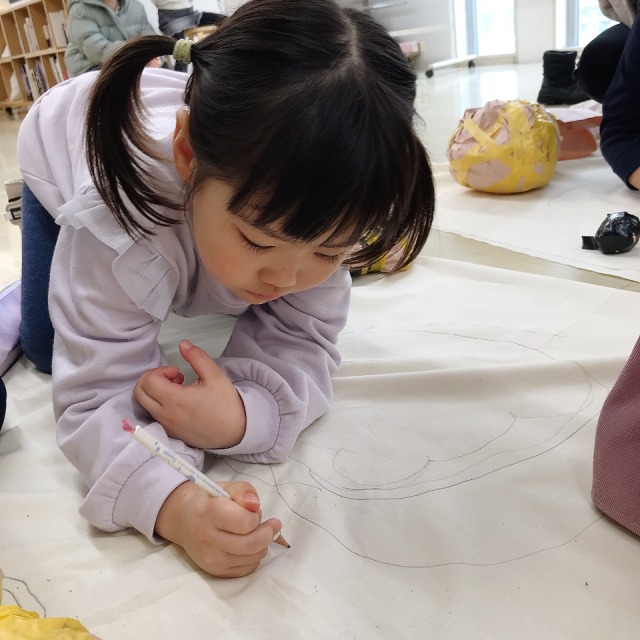 そんな中、なんだか不思議な形のものが登場。「それなに?」「むし?」ぐんにゃり曲がって、細いところや太いところ。それにシッポやくちばしみたいな出っ張りも。「動物かな?」「なんかの文字?」謎すぎる形にこどもたちの注目が集まりました。