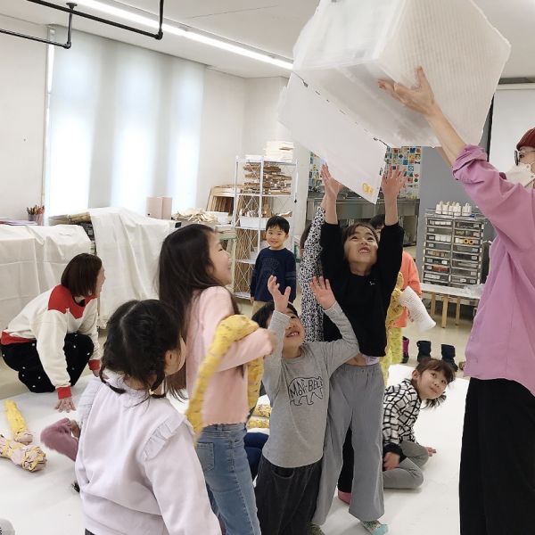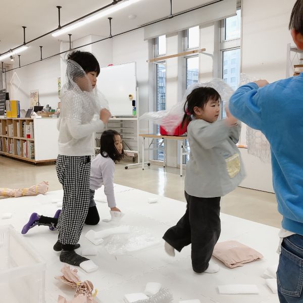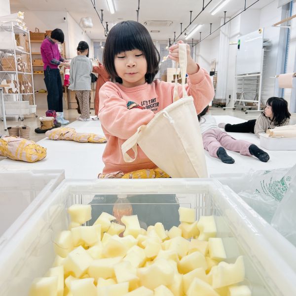 例えばスポンジ素材は布越しだと不思議な凸凹が出るのが特徴で、やわらかいけど独特な弾力があり「綿よりも丈夫な感じがする。」いろいろ試しているうちに、こどもたちは自然と異素材を詰め合わせて、自分好みに感触をブレンドし始めました。
