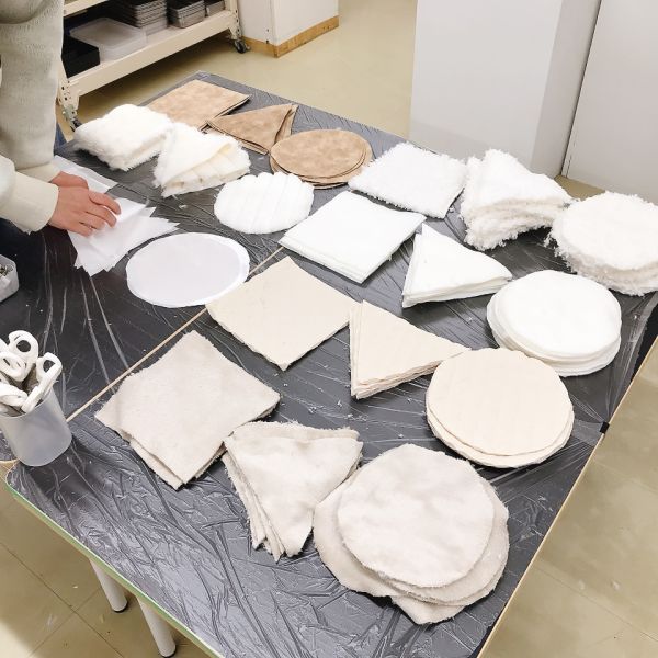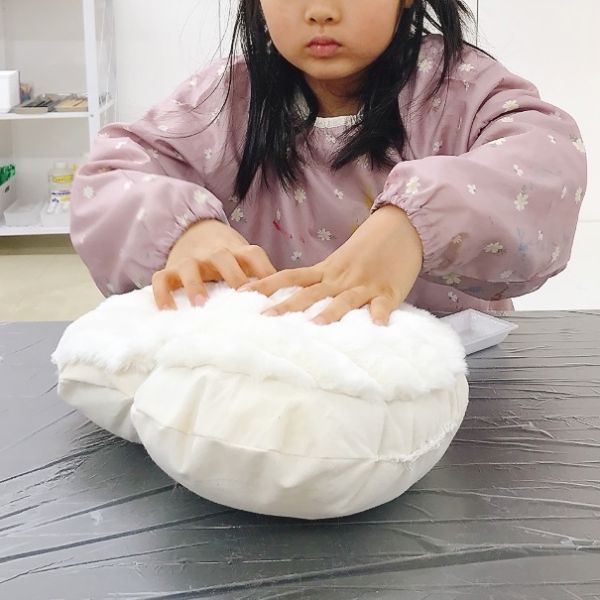 こどもたちに人気ナンバーワンの素材は、ふわふわの綿。でも「これだけだとやわらかすぎる」という声も多く、「綿をちがう素材で包んでみよう」「層にしながら重ねてみよう」などの工夫が。感心するほどのこだわり方です。