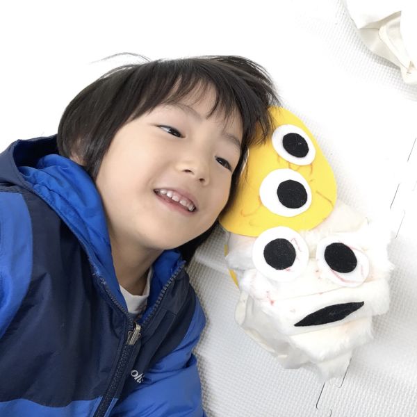 こちらの子は「目をつけたらどうなるだろう?」と、まずはお気に入りの目を作り、作品につけてみました。するととたんに色や形のイメージが浮かんできたようで、「トゲトゲがほしい」「ツノもある!」など制作の手が止まりません。