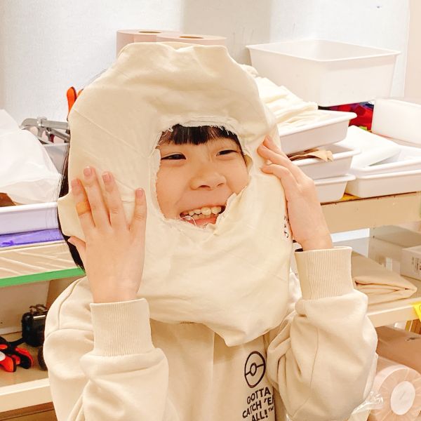 こちらは自分の首にフィットさせるため、「作品の一部を膨らませたい」という子。やわらかいボールを入れてみると「ちょうどここだけ膨らんだ!」そこから数や密度を調整して「首の下の隙間にぴったり!」とうれしそう。