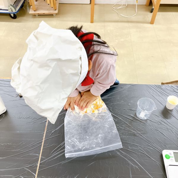 袋に入れて混ぜると、前回のタルト生地とはちがう、すごくやわらかい感触。砂のザラザラした感触も、ちょっと新鮮な様子です。「これも気持ちいい」と楽しさや感触のおもしろさに、みんなの顔がにんまり。「混ぜやすい」「もうできたよ!」自信たっぷりの声がたくさん聞こえました。