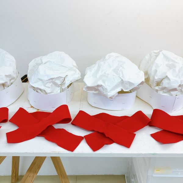 前回作ったタルトの土台。乾燥させてしっかり固まり、本当にお皿のようになっていました。少しヒビが入っていてもなんだかリアルな質感に、みんな嬉しそう。「今日は中身づくりね!」テーブルにどうぐを出し、パティシエの帽子をかぶったら、おしごと開始。
