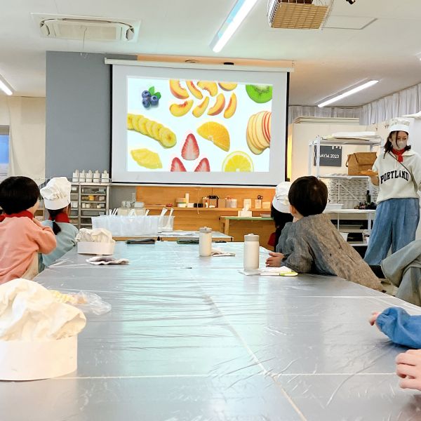 これから作るタルトの中身は、大きく分けると「ダマンドクリーム」と「トッピング」の2つ。こどもたちはフレッシュな果物たっぷりのタルトを作りたい子が多い様子です。そこで、カットされたフルーツの例を紹介してみると「うわ〜お!」と歓声が。早く作りたくて、気持ちが大盛り上がり。