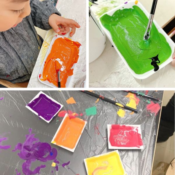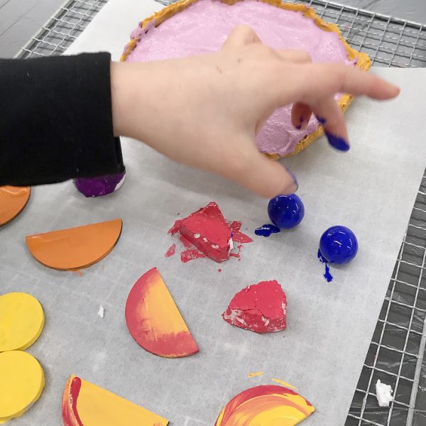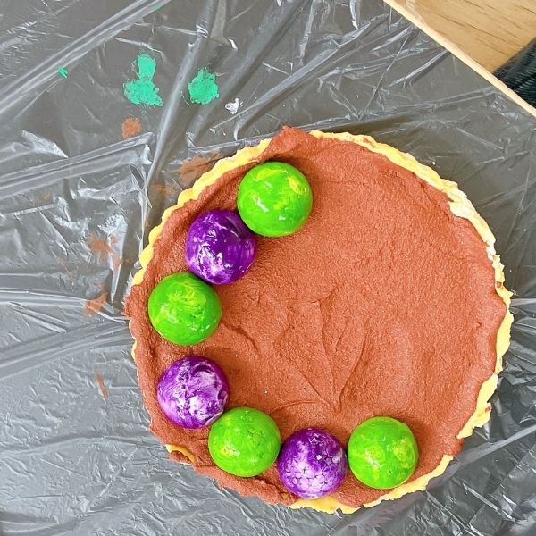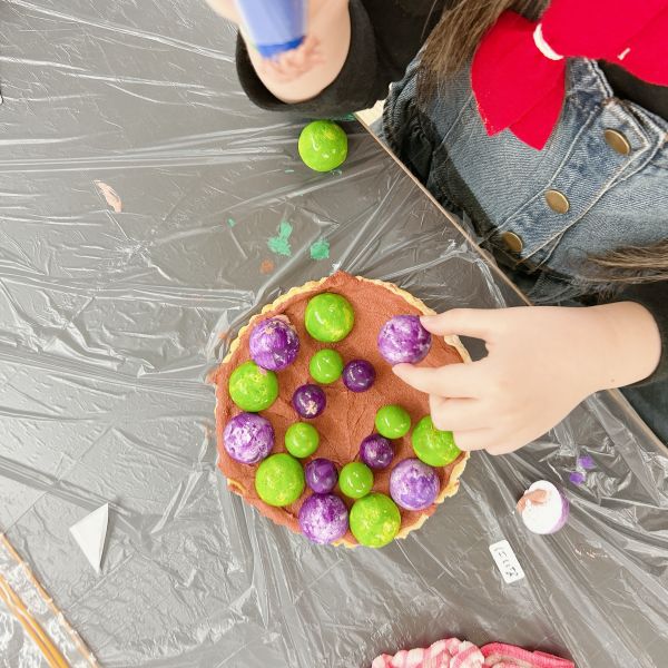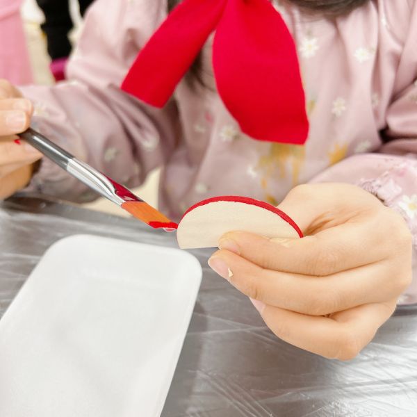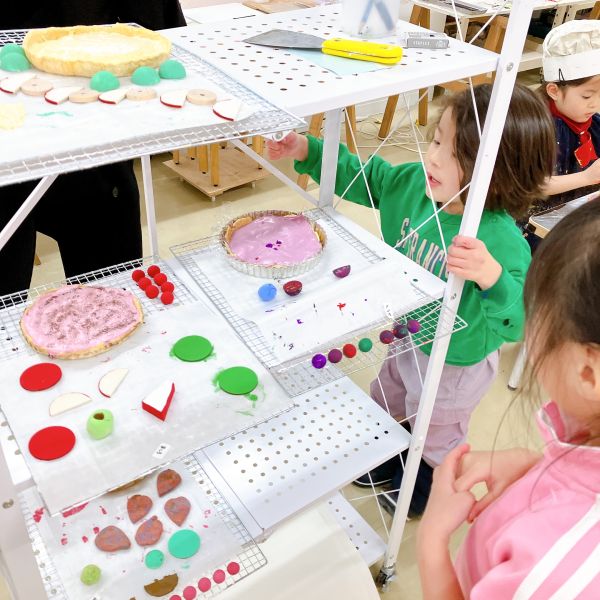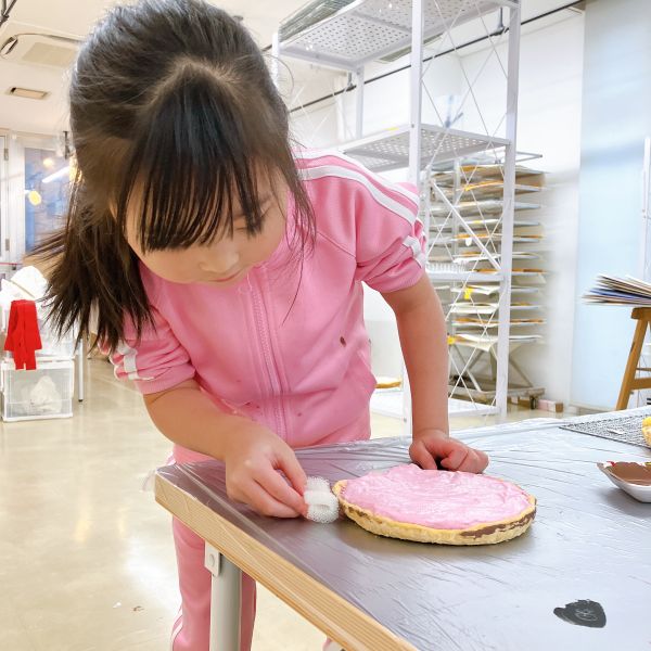 「タルトの土台は、焼いたらきっとこんがりしてるよね?」「それも作りたい!」と、絵の具とスポンジを使って、タルトにこんがり焼き色をプラスしているこちらの子。リアルなイメージがどんどん膨らんでいる様子。もう、本当に、おいしそう…