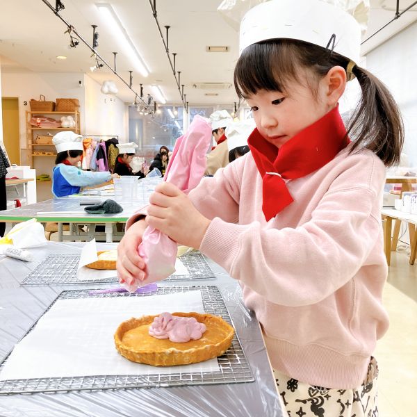 袋の角を切り落として、タルトの中にむぎゅ〜っと絞り出し。袋から出てきたクリームは、ものすごくリアル!自分の想像した通りのクリームができて、何だかいい香りまで漂いそう。「ひゃー、おいしそう!」「これ楽しい!」「しっかりしぼり切るぞ!」どの子も真剣そのもの。