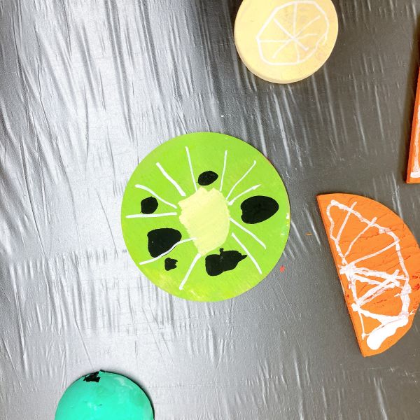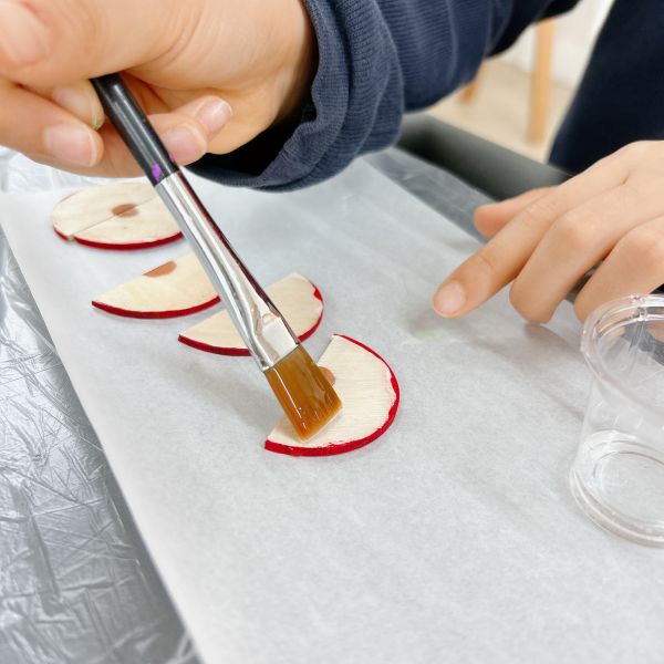 それぞれの果物の描き込みが終わったら、さらにニス塗りを。ぷっくり、ツヤツヤな表面になると、一気にジューシーさや新鮮そうな雰囲気がアップ!こどもたちは「すごくおいしそう〜」とますます盛り上がり、気持ちが前のめりに。