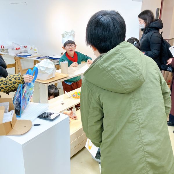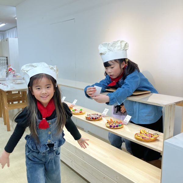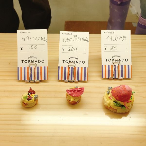 自分の作品に商品タグをつけて、ひとつひとつ棚にきれいに並べていきました。これはもうすっかり、リアルなお店屋さんの雰囲気!さっそく「いらっしゃいませ」「これをください」小さなこどもたちが一生懸命作った、タルト専門店がオープン!