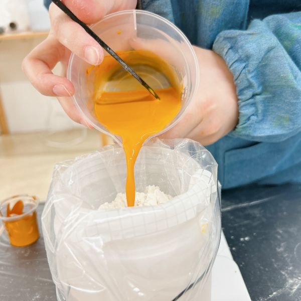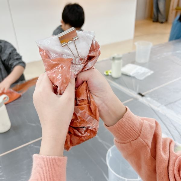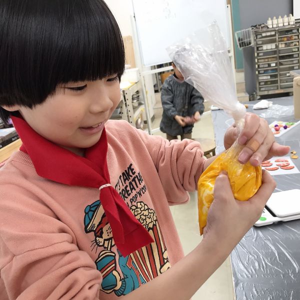 表面の飾りに使うためのクリームも、自分たちの手で作りました。混ぜたのは紙粘土と水、そして木工用ボンド。キッチンスケールの登場に「計りはもうまかせて!」というくらい、みんなすっかり使い慣れた様子で自信満々です。絵の具をチョイ足しして、好みのフレーバークリームにする子も。袋の口を結んだら…