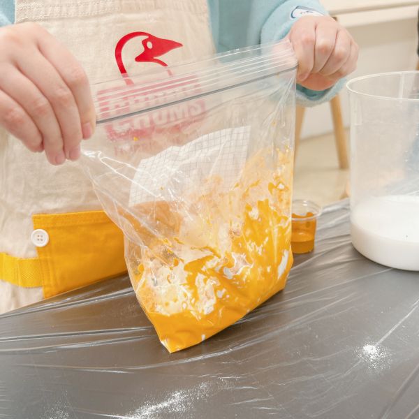 タルト生地にはたまごが使われます。が、今回は絵の具とボンドを混ぜた水で代用。色はもちろん、トロッとした質感も本物のたまごそっくり!ぴったりの量を、先に計った小麦粉や塩の袋に入れていきます。液体を注ぐ作業に、ちょっとドキドキな様子…