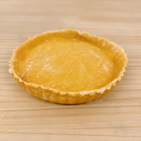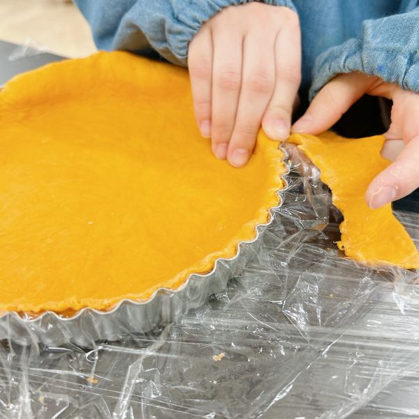 タルト型の大きさより一回り大きめに広げられたら、型の内側に敷き詰めていきます。生地を持ち上げて型の上に乗せ、指でやさしく押し付けながら、型のふちの高さに沿って形を整えていきました。凸凹しているので、1箇所ずつていねいに。縁からはみ出した余分な生地をはさみで切り落とすと「うわあ!本物だ!」