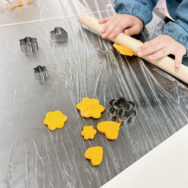 作業台の上に生地をのせて、めん棒でよく伸ばします。これはみんな粘土でよくしているので、すごく上手!なのですが、一定の大きさ以上に広げようとすると「生地がちぢんじゃうよ!?」実は今回、作品が割れにくいように強力粉を使いました。薄力粉よりもグルテンが多く、生地に弾力があるのです。ここも「えい!」体重をかけて作業していました。