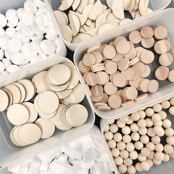 果物の色ができたところで、木や発泡素材のいろんな形のブロックが登場しました。「色を塗ったらキウイになりそう!」「これはイチゴになりそう!」制作の勢いが止まりません。「早く塗りたい!」「10個くらい作らないと!」