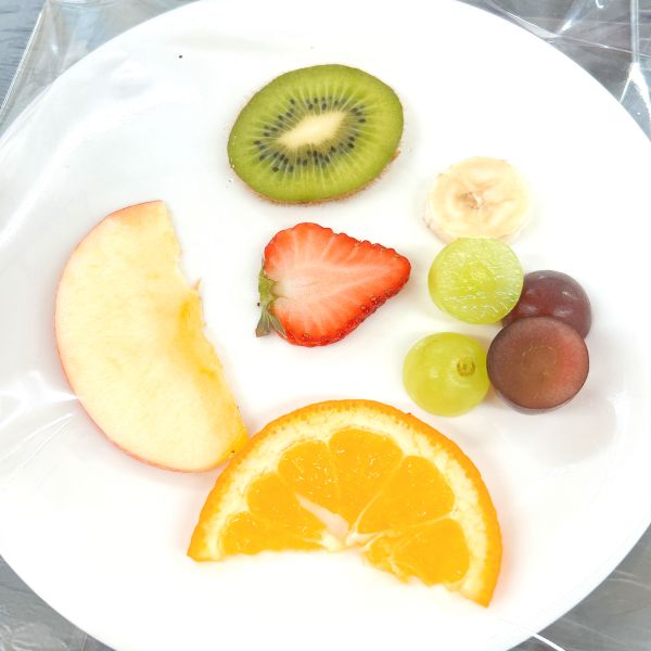 クリームを入れ終わったら、次のお楽しみ。トッピングフルーツ作りでは、サンプルとして本物のカットフルーツも登場!「わ〜」「食べたい」「いいにおい!」おいしそうなフルーツを目指して、絵の具の色づくりからスタートです。