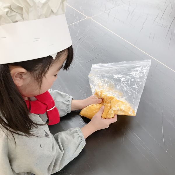 お楽しみの「もみもみ!」このタルト作りのプログラムでは、毎回何かを混ぜて材料を作りました。それぞれちがう感触なのが新鮮なようで、こどもたちも「次はどんな感触かな」とワクワクな様子。「机にぎゅっと押すといい」「振ると混ざるよ!」自発的にいろんな混ぜ方を発見していました。