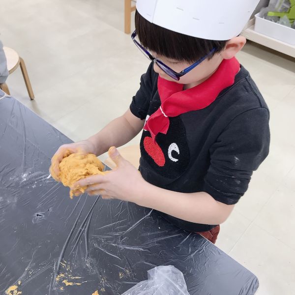 キッズのまだ体が小さなこどもたちは、全身の体重をかけるように一生懸命!想像以上に大変だったようで、ニコニコしながらも「もうだめだ」「手がつかれてきたよ!」なんて声も。ひじやひざなどを使ってぐりぐり!自分なりの練り方法を編み出していました。