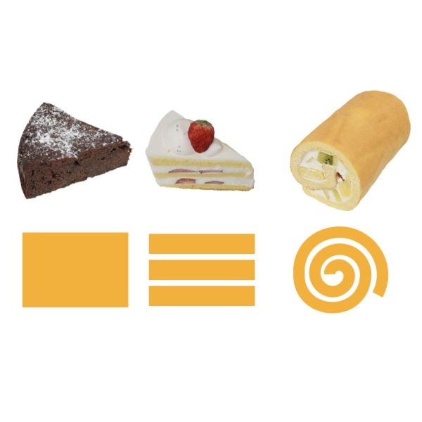 例えば、ガトーショコラやシフォンケーキは生地が1種類で、型に入れて焼くだけで完成するシンプルなケーキです。でもショートケーキやミルフィーユなどは、生地やクリームが層になって積み重ねられていますね。ロールケーキは、生地にクリームを乗せて、くるくると巻いて作ります。