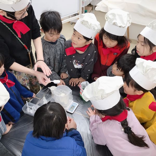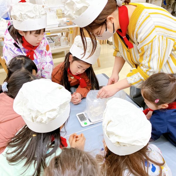 まずは材料の計量から。キッチンスケールや計量カップを使って、自分で分量を計ることにチャレンジ。まだ数字に慣れていない小さな子たちは、計量カップの線を手がかりに体験しました。料理のどうぐの登場で、みんなとたんに真剣に!