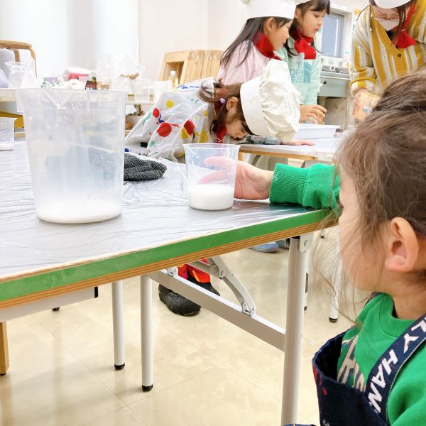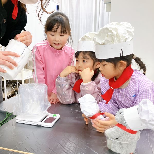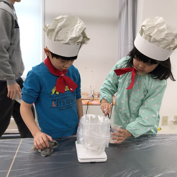 お菓子作りは、正確に材料を計ることがとても大事です。小麦粉や塩のグラム数を確認しながら、ぴったりに計ると「気持ちいい!」。お料理に慣れている子は、小麦粉をこぼさないために「こうするといいんだよ!」と"すりきり"を教えてくれる子も。「OK、できたよ!」次々に進みます。